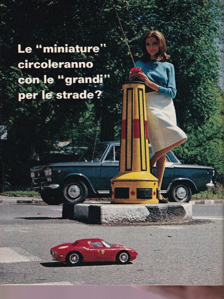 Неудивительно, что однажды посреди хаотичного движения наших городов мы увидели красный Ferrari 250 Le Mans, длиной около тридцати сантиметров, едущий один, проскальзывающий между колесами обычных автомобилей, останавливающийся и возобновляющий движение на светофоре. Это вырезка из статьи в итальянском журнале 1966 года , рассказывающей о не виданном до селе продукте - радиоуправляемой машинке. К середине 1966 года было выпущено несколько ранних коммерчески жизнеспособных радиоуправляемых автомобилей, произведенных итальянской компанией El-Gi (Elettronica Giocattoli) из Реджо-Эмилии. А их первую модель, Ferrari 250LM 1: 12, принято называть первой радиоуправляемой моделью автомобиля в мире, которая послужила основой для хобби миллионов людей по всему миру и породила целую индустрию. Пульт управления представлял собой коробку с телескопической антенной и передатчиком. На пульте есть четыре клавиши: первая, вверху (Выкл.-вкл.), функционирует как простой переключатель для запуска пер