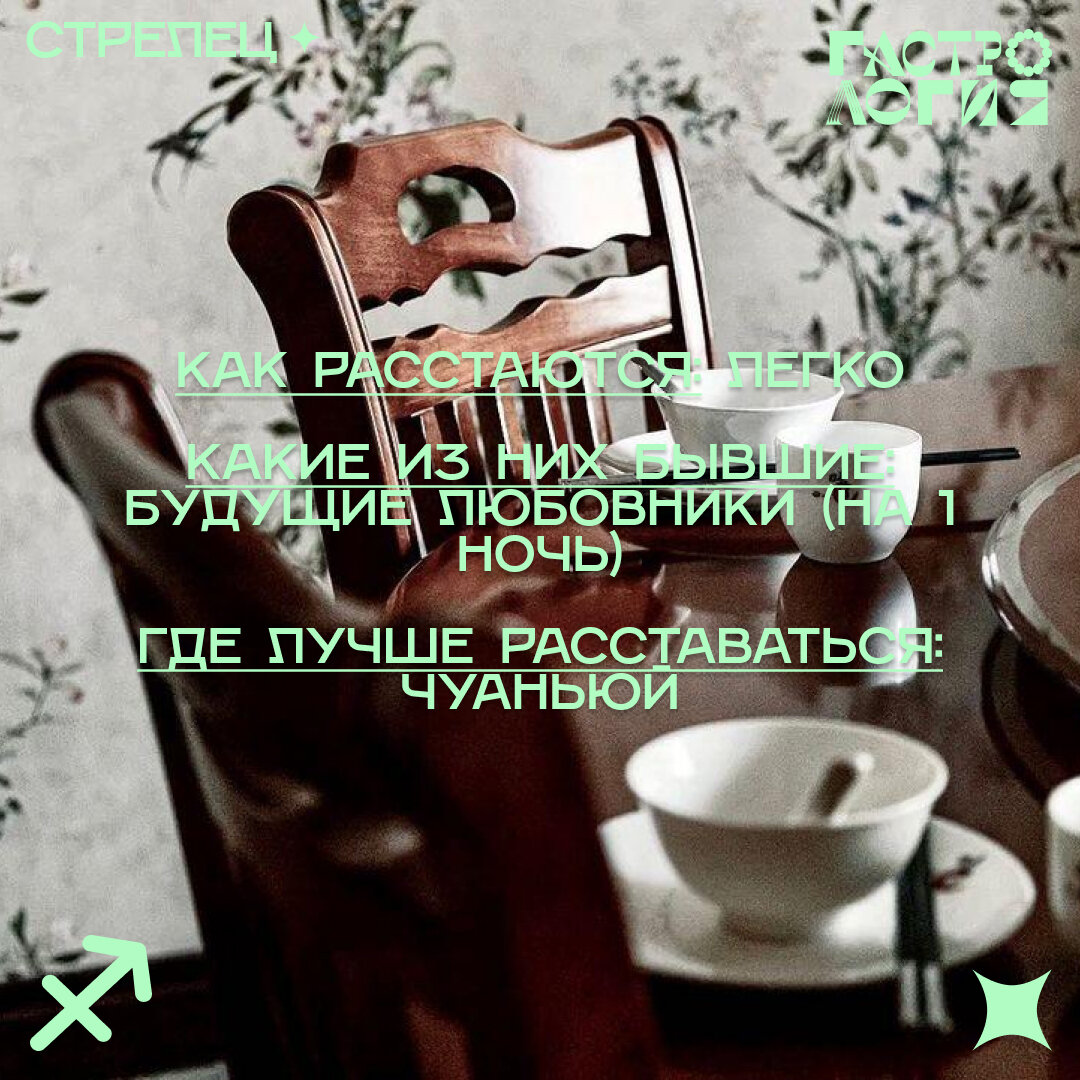 Как расстаются: легко Стрельцы всегда ищут новых острых ощущений, а когда они чувствуют, что их кто-то контролирует, пытаются вырваться, как искра из костра. В душе они кочевники и могут выйти из отношений легко, сделать рывок вперед и вид, что ничего и не было. Жестко и сурово, но и огонь жжется. Но вот если бросят их (еще и неожиданно, а это всегда неожиданно, потому что они как оптимисты видят только светлую сторону и не подозревают о грядущей буре), то Стрельцы сделают все, чтобы вернуть любовь. Звучит романтично, но это не имеет почти ничего общего с любовью, скорее с импульсом и духом соперничества. А вот готовы ли Стрельцы остаться, если их пустят обратно – хороший вопрос, который лучше бы решить на берегу. Какие из них бывшие: будущие любовники (на 1 ночь) Стрельцы легкие, остроумные и дружелюбные, поэтому им легко остаться приятелями со своими бывшими и твердить, что они «просто друзья», но если их экс когда-нибудь снова уронит на них взгляд, полный романтики – Стрельцы первые