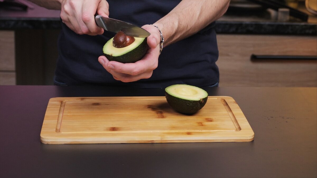 - Чистим авокадо. Для этого нарезаю его, а потом выгребаю всю мякоть ложкой. Быстро и просто.
