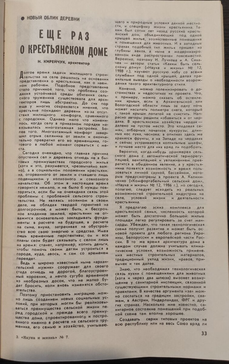 В 7 номере журнала "Наука и жизнь" от 1989 года архитектор Кирейчук представил будущее крестьянского дома. Автор тонко подметил проблемы строительства на селе. Например, отмечая бесперспективность возведения типовых многоэтажек в деревнях и селах. "Многоэтажный комфорт завершил отрыв селянина от земли и окончательно превратил его во временщика, готового в любой момент сорваться с места." Автор справедливо считает, что отъезд крестьян в город можно остановить созданием новых социальных условий. Конечно, надо начинать с самого главного- дома! Кирейчук предлагает интересный вариант крестьянской усадьбы. Надо сказать, что для того времени, это был бы любопытный дом! В нем, практически, учтено все. Дом весьма комфортабелен, в нем все предусмотрено для приятной жизни. Естественно, в усадьбе предусмотрены множество подсобных помещений, например птичник, коптильня, коровник, свинарник, сечкорезка, даже подстилочная с навозохранилищем. Жаль, что проект не получил продолжения. Было бы интере