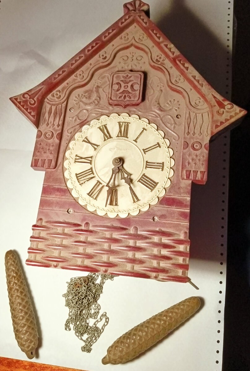 Доброго времени суток! Вот такие часы сегодня буду обслуживать - кукушка из СССР. Часы конечно лежали видимо у кого - то в чулане - все в пыли. Комплект полный - цепи, маятник и гири присутствуют. Снаружи конечно слегда потёртые, но для их возраста это нормальное состояние. Внутри даже лучше чем снаружи, всё целое, даже пыли особо нет. Такое ощущение что их когда то давно отремонтировали и просто положили до лучших времён. Маятник точно требует покраски, а гири посмотрю - отмою может и пойдут. Буду разбирать и чистить. Вначале снял стрелки. Открутил 4 самореза которые держат переднюю панель с циферблатом. Отсоединяю кукушонка - нужно разогнуть проволочку которая соединятся с дверцей. Снял заднюю часть корпуса. Механизм крепится на четырёх гайках. Со стороны циферблата тоже сильных загрязнений не наблюдаю. Откручиваю так называемые - меха - именно с помощью них она и кукует. Снял скобу-маятник. Чтобы снять цепи разогнул колечко - оно мешает снимать цепь. Цепи снял - длинна цепи - около