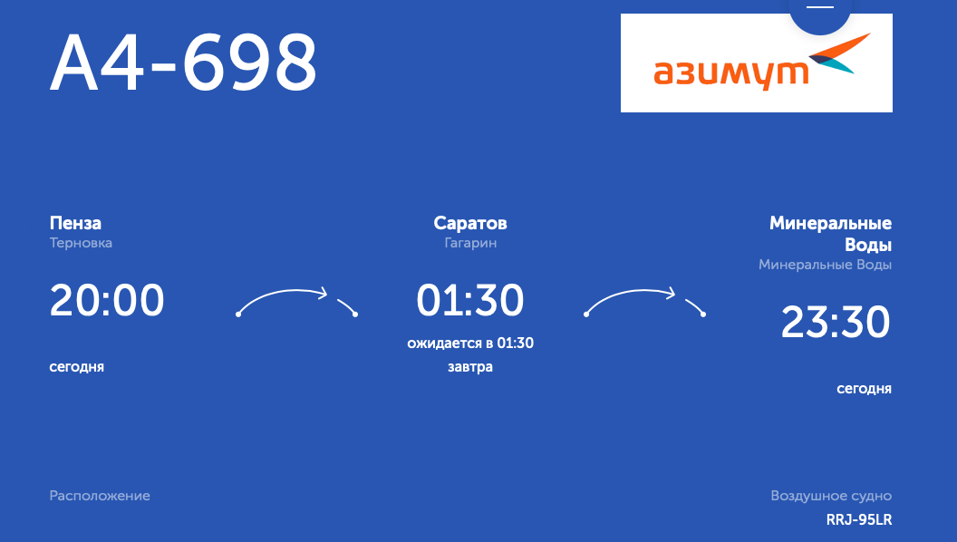 По данным служб аэропорта Пензы, самолет Sukhoi Superjet 100 авиакомпании «Азимут» должен был вылететь в 13.05 по местному времени и приземлиться в Минеральных Водах в 15.50. Саратовский аэропорт «Гагарин» указывает, что рейс вылетел только в 20.00, а самолет и его пассажиры пробудут в Саратове как минимум до 1.30 вторника, 8 ноября.