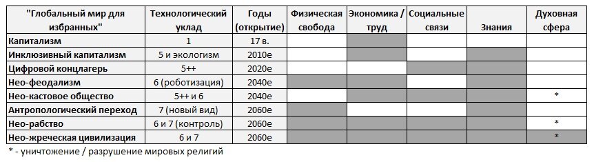 #геостратегия Вариантов глобализма большое количество, тот же коммунизм лишь одна из форм. Варианты глобального будущего можно разделить на две группы: «глобальный мир для всех» (левые варианты) и «глобальный мир для избранных» (правые варианты). Последняя группа – суть антиутопии, но именно такие построения привлекательны и интересны элитам, как позволяющие сохранять доминирующее положение, статус, управление и контроль над остальным населением. В общественном дискурсе данной теме посвящено много обсуждений и страхов, постоянно происходят смешения, подмены, манипуляции и нагнетание. Практически у всех отсутствует понимание, где заканчивается достижимая реальность и начинаются оторванные от технических условий фантазии. Существует множество разных вариантов «глобального мира для избранных», в рамках каждого из них элиты будут пытаться контролировать максимум аспектов жизни, но для каждого можно выделить ключевые, базовые, первичные, подверженные закрепощению аспекты. На картинке предст