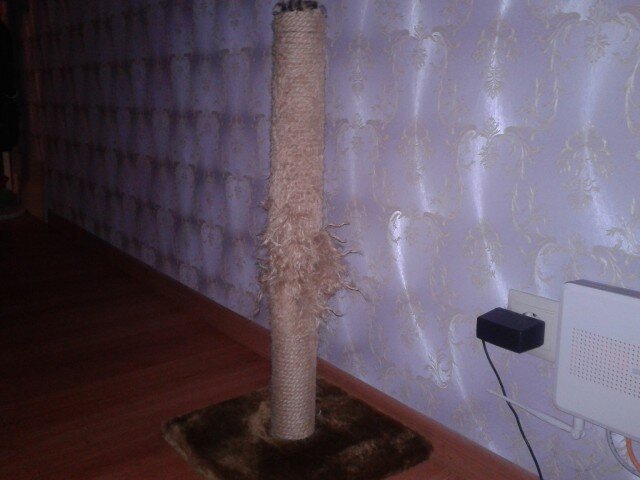 Решил я как то собрать кошке искусственное дерево, ради спасения мебели и своих нервов. Все попытки отучить её от столов и бытовой техники провалились. Она размещалась всюду и везде, кроме спец. места. Покупная когтеточка надоедает, ободрать двери куда интереснее. Да и видок у неё за год – два уже потрёпанный. 23 фото и текст И так, купил две трубы в леруа, канализационные по 2 метра и соединитель. Собрал задуманную конструкцию и закрепил саморезами. Каждое соединение на 4-5 саморезах, для веса кошки достаточно, плюс всё это будет затянуто канатом, зафиксируется. Полочки вырезал из пвх сэндвич панелей, чтобы конструкция сверху была полегче. Склеил две вместе (одна слишком тонкая) и обшил ковролином. Крепим полочки. Под основание взял старую, ободранную когтеточку, прикрутил на неё брусков, чтобы плотно налезла труба. Крепил на что хватило извращенной фантазии и хлама с балкона. Фантазия и хлам: столешница от неудавшегося откидного столика на балкон, обрезиненные блины от гантели по 2,5