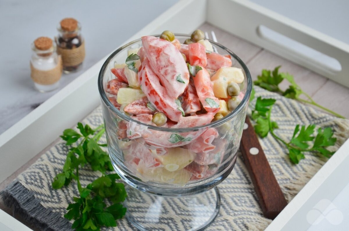 Ингредиенты Пошаговый рецепт приготовления Поставьте вариться картофель в кожуре. Колбасу очистите от оболочки и нарежьте соломкой, положите в салатник. Также нарежьте помидоры и положите в миску. Когда картофель сварится, почистите его и нарежьте соломкой. Добавьте консервированный горошек. Добавьте майонез, мелко нарезанную петрушку, соль и специи. Перемешайте салат и попробуйте на соль. Подавать салат желательно сразу после того, как заправили. Из-за сочного помидора он может достаточно быстро стать водянистым.