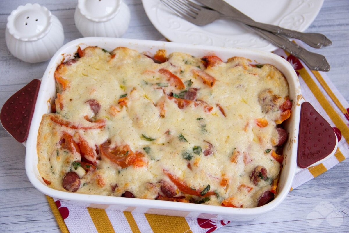 Запеканка с болгарским перцем, помидорами и охотничьими колбасками