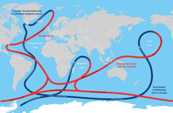 Гольфстрим — это теплое морское течение Атлантического океана, которое выходит из Мексиканского залива в Северную Атлантику и достигает берегов Западной Европы. Его скорость 3,6–10 км/ч, а средняя годовая температура поверхности +25 °С. Теплый Гольфстрим обогревает холодный арктический воздух, который ветрами переносится на северо-запад Европы, поэтому климат там теплее на 5 °С, чем в других местах на аналогичной географической широте. Двигаться с юга на север течение заставляет разница солености и температуры между водами Северной и Южной Атлантики. На образование ледников, покрывающих Гренландию и Арктику, уходит большое количество морской воды, но только опресненной, растворенные же в ней соли остаются в океане, поэтому соленость воды у берегов Гренландии сильно увеличена по сравнению с более южными участками. Более соленая, а значит, более плотная вода, опускается на глубину, и на ее место поступает теплая и легкая из Южного полушария, которая тоже остывает, опускаетс