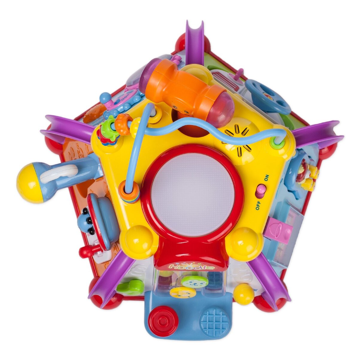 Здравствуйте, Уважаемые друзья!!! Сегодня я хотел бы Вам рассказать о такой развивающей игрушки для малышей как «Игровой центр BabyGo "Активити"». Мы сделали такой подарок нашей дочке на ее 6 месяцев нахождения у власти=), хоть на упаковки и написано, что с 18 месяцев (я думаю это просто рекомендательный характер), но наша малышка накинулась на этот центр в 6 месяцев и сегодня играется и не нарадуется, понятно, что некоторые моменты она еще не делает на нем, но дальше больше, главное, что ребеночку нравиться и она развивается. И так немного о том, что входит в данную модель игрового центра: По пластиковым "дорожкам" можно перемещать разноцветные бусинки. Имеется маленький молоток, которым в свою очередь нужно бить по панелям на одной из сторон перегоняя шарик. На одной из сторон расположен микрофон: включите его и переведите в рабочее положение. Если нажать на выключатель-звонок, на дисплее сменятся картинки. На одной стороне – настоящий водительский руль и ключ зажигания, можно завест