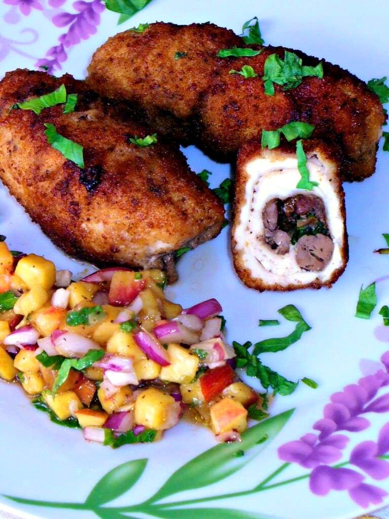 Куриные рулетики с печенью и сальсой из нектарина. 300 гр.куриной печени вымыть, обсушить. Нарезать не крупно. 1 репчатую луковицу нарезать мелко. На растительном масле обжарить лук и печень. Посолить, поперчить, приправить кориандром и орегано. Остудить. 1 крупное куриное филе вымыть, полностью обсушить. Нарезать на отбивные. Я взяла крупное филе и получила 6 отбивных. Отбить отбивные, используя пищевую плёнку. Оставить отбивные в морозильной камере на 10 минут. Вынуть отбивные, удалить пищевую плёнку. Посолить, поперчить. На каждую отбивную выкладывать начинку из печени, веточку свежей петрушки. Завернуть рулетом. Яйцо взбить вилкой. Окунать куриные рулетики в яйцо и панировать в панировочных сухарях. Обжаривать рулетики на растительном масле, до уверенной румяной корочки, со всех сторон. Затем убавить нагрев, закрыть крышку и довести до готовности. Подавать с сальсой из нектарина и ялтинского лука. Для сальсы нарезать 1 крупный нектарин, 1 небольшую ялтинскую луковицу. Добавить св