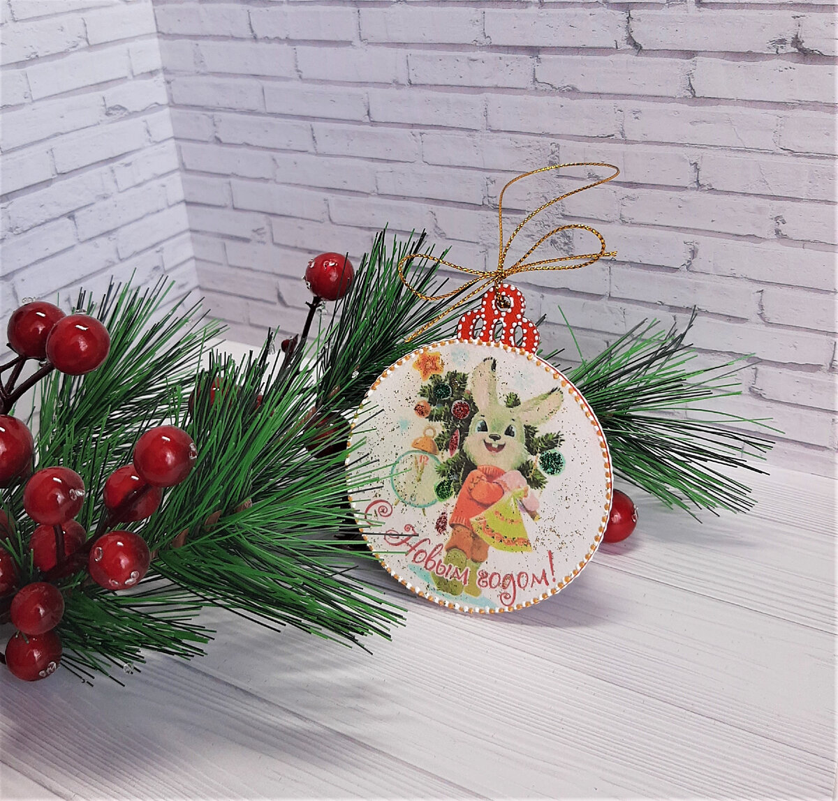 Всем-всем хорошего дня! Всё больше ленты в дзене пестрят новогодней тематикой))). Наступает мое любимое время — пора готовиться к самому сказочному празднику в году. Особенно ярким это ощущение было в детстве, когда мы верили в чудеса и подарки от Деда Мороза))). Предлагаю вспомнить вкус детства и смастерить несложное елочное украшение с зайкой — символом наступающего года. Не просто зайкой, а персонажем замечательных открыток с рисунками Владимира Зарубина. Согласитесь, сразу повеяло ароматом мандаринов и запахом хвои... Приступим))). Понадобится: деревянная заготовка-медальон, распечатка, декупажная салфетка, акриловые белая и красная краски, акриловый лак, наждачка, клей ПВА, акриловые контуры с блестками и матовый белый, золотой шнур. Каждый этап работы закрепляем акриловым лаком! Медальон покрываем белой краской в качестве грунта, сушим, шлифуем, а распечатку покрываем лаком для прочности: Одна сторона медальона будет с зайкой: Оборотная сторона - с мотивом из салфетки: Контур и