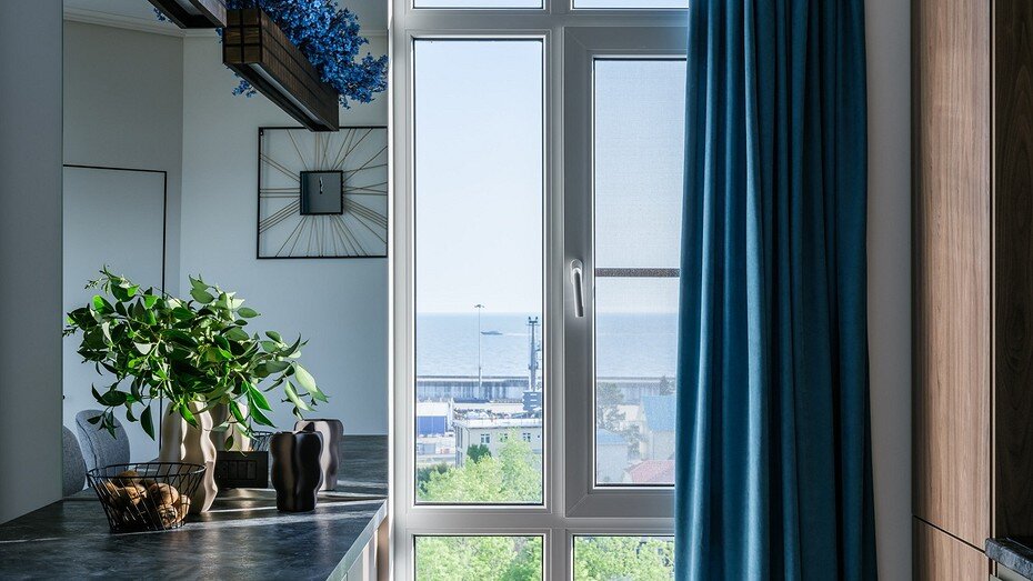 Из окон квартиры, расположенной на 8-м этаже, открываются виды на Имеретинский морской порт и на эвкалипты национального парка. Пейзажам вторят абстрактные картины. Их написали дочери заказчика на мастер-классе у авторов проекта — лайфхак объединения творчества и экономии.