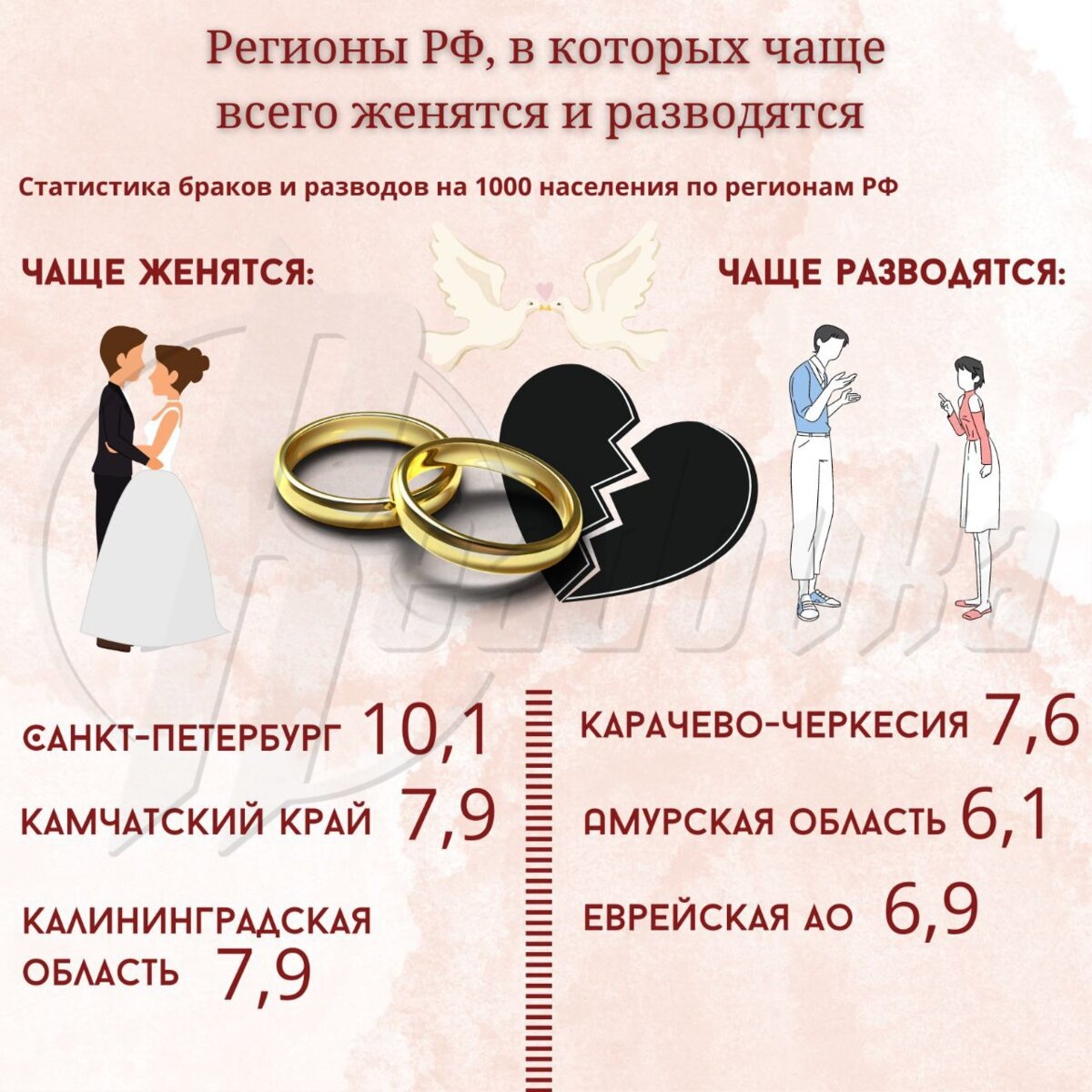 По данным РОССТАТ, количество заключаемых браков весьма статично. Россияне стали чаще разводиться. Так, в январе-августе число разводов на 1000 человек населения составило 4,6, что является большим коэффициентом, чем в аналогичном периоде прошлого года (4,4), пишет «Абзац» на основе данных Росстата. Победителями в наибольшем числе бракоразводных процессов стали: Карачаево-Черкесия (7,6), Еврейская автономная область (6,9) и Амурская область (6,1). Меньше всего расторжений официально зарегистрированных отношений было в Мордовии (3,1), Республике Тыва (3,2) и Ненецком автономном округе (3,3). В свою очередь, коэффициент заключенных в России браков на 1000 населения статичен совсем не изменился – 6,3. Самыми «свадебными» стали: Санкт-Петербург (10,1), Калининград (7,9) и Камчатский край (7,9). Официально регистрировать отношения хотят меньше всего в Ингушетии (2,2), Дагестане (2,9) и Чечне (3). В целом с января по август текущего года поженились 608,4 тысячи пар, а развелись 443,1 тысячи