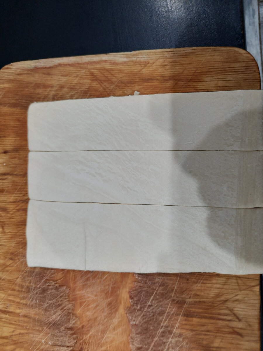 Начнем приготовление наших вкусненьких сосисок. Размораживаем тесто и нарезаем на полоски.