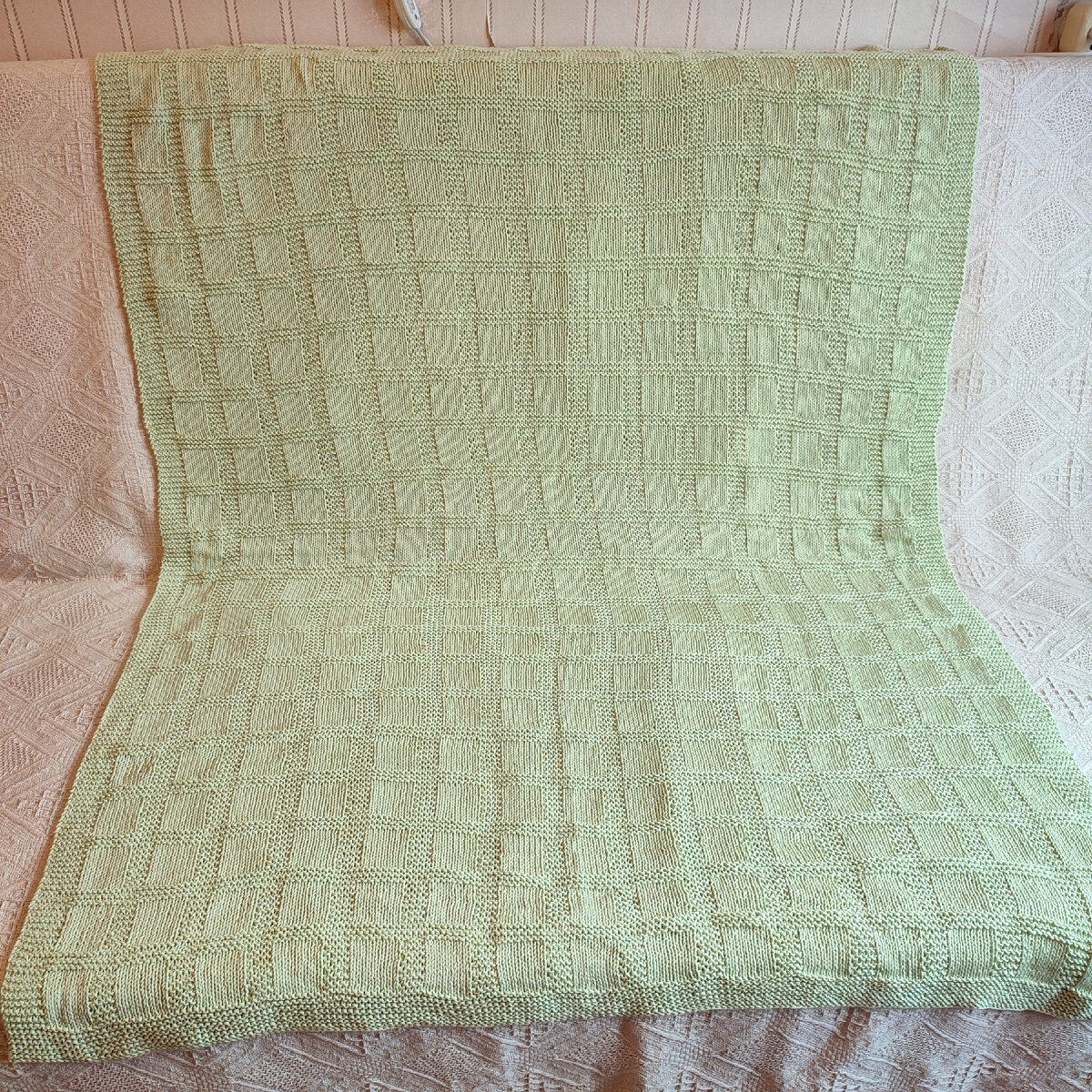 Пряжа Nako Calico, цвет 6707 светлый салатовый, 245м /100г, 50% хлопок, 50% акрил, 7 мотков Размер 110см*150см на возраст 3-5 лет Спицы 3,5 мм Плотность: 18п*27р = 10*10см На спицы 3,5 мм набрать 192п. Для нижней планки связать 16р платочной вязкой: лицевые и изнаночные ряды – лицевые петли. Кромочные петли также провязывать лицевыми в начале и в конце ряда. Далее вязать узор. Сначала провязать 4п платочной вязкой (1 кромочная и ещё 3п), далее провязать 15 раз раппорт узора на 12п и в конце провязать 8п платочной вязкой (7п и 1 кромочная). В высоту 21 раз повторить раппорт на 18р. И для верхней планки связать 10р платочной вязкой. Весь плед 404р #knitting #вязание