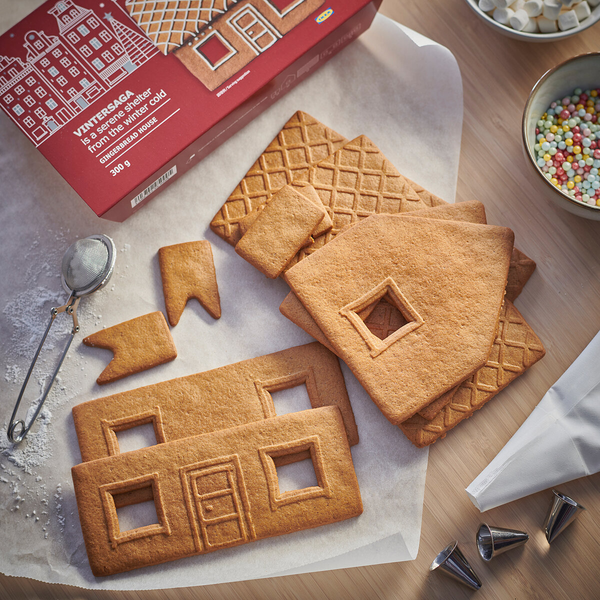 Традиции печь пряничные домики, раскрашивать их глазурью, вешать на новогоднюю елку уже не кажутся заимствованием с Запада, а вполне вписываются в наш образ жизни. Сделать пряничный домик с нуля, согласитесь, достаточно трудоемкий процесс: замесить тесто, вырезать и выпечь в необходимых формах, проследить, чтобы не сгорело и хорошо выглядело, далее приготовить глазурь, остудить. Процесс растягивается на весь день, а то и на несколько. Удовольствие от процесса теряется однозначно. Это поняли бренды и предложили DIY-наборы, которые уже готовы к росписи и украшению дома. Один из самых популярных наборов, как ни странно, выпускают не продуктовый бренд, а IKEA. Набор Vintersaga включает в себя имбирные печенья-детали для будущего дома, несколько тюбиков глазури и сахарные посыпки для украшения. Печенья идеальной формы, ароматные и хрустящие, их остается только украсить и собрать конструкцию. Не нужно замешивать тесто, остужать и вымерять размеры. IKEA дополнительно позаботились о надежной у