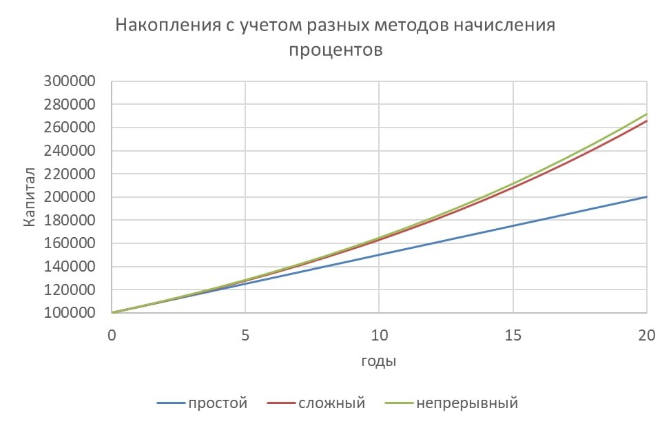 Возьмем депозит со ставкой 5% годовых. Если вложить 100 тысяч на двадцать лет, наш капитал вырастит до 200 000 при простом проценте, до 265 329,8 при сложном, и до 271 828,2 при непрерывно начисляемом.