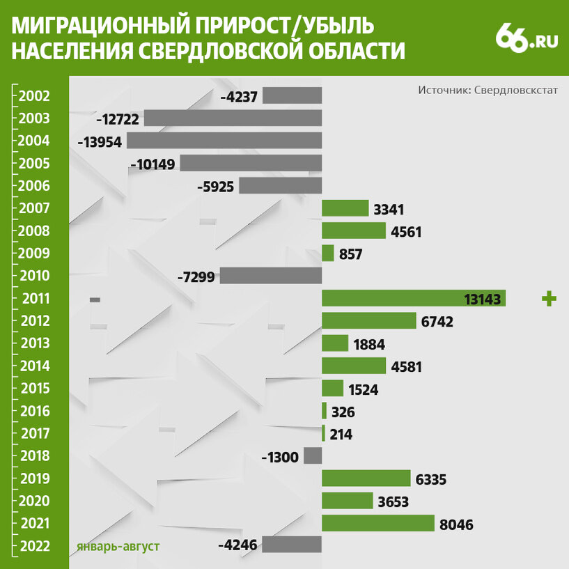 Свердловскстат зафиксировал рекордную миграционную убыль. Количество выбывших в январе—августе 2022 года превысило количество прибывших на 4264 человека. Для сравнения: за аналогичный период 2021 года прирост превысил 4,4 тыс. человек, а по итогам 2021-го — 8 тыс. человек. Максимальная разница между приехавшими и уехавшими из Свердловской области — внутри России (-1988 человек). На втором месте — страны дальнего зарубежья (-1439 человек). И этот показатель нетипичен для региона. Как правило, если Свердловскстат фиксирует рост оттока за границу — это ближнее зарубежье. Здесь убыль составила 837 человек. Хотя за аналогичный период прошлого года прирост составил более 5 тыс. человек. Если смотреть по годам, то с 2002 по 2006 год Свердловскстат фиксировал миграционную убыль (максимум — 13 тыс. человек за год), затем шел небольшой прирост. После отрицательного значения по итогам 2010 года, количество въехавших в регион превалировало над количеством убывших. Максимальная прибыль зафиксирован
