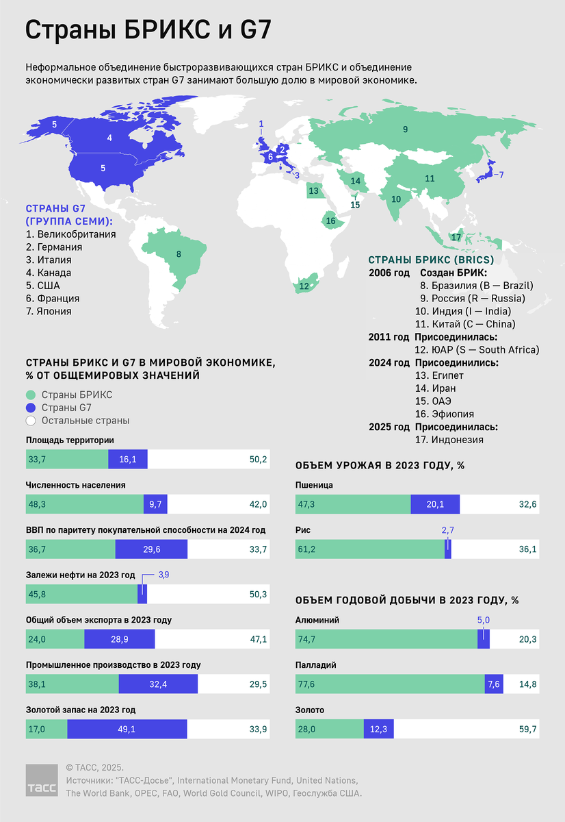 Подробнее об экономических показателях БРИКС и G7 и их долях в мировой экономике — в инфографике ТАСС.