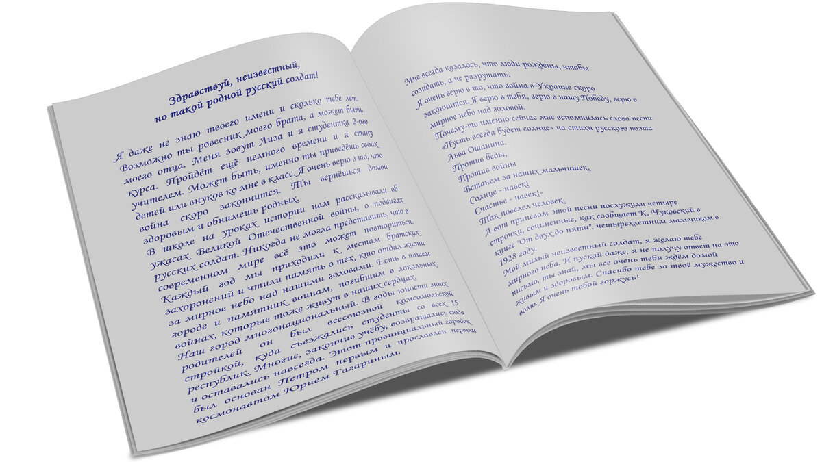 Я даже не знаю твоего имени и сколько тебе лет. Возможно ты ровесник моего брата, а может быть моего отца. Меня зовут Лиза и я студентка 2-ого курса. Пройдёт ещё немного времени и я стану учителем. Может быть, именно ты приведёшь своих детей или внуков ко мне в класс. Я очень верю в то, что война скоро закончится. Ты вернёшься домой здоровым и обнимешь родных.