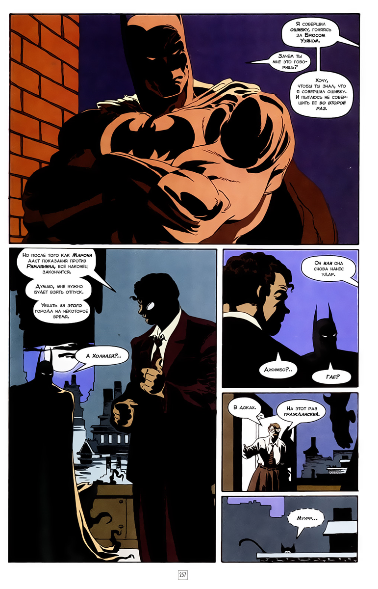 В ту ночь, 4 июля, повсюду били салюты, а возле пристани был убит готэмский следователь. Я был в поместье вместе с Селиной, мы вместе праздновали день Независимости. Вскоре меня позвал Дент и сказал, что совершил ошибку, охотясь на меня. Немногим позже Пугало и Безумный Шляпник ограбили банк, что вызвало моментальную реакцию с моей стороны . Я переломал рёбра Пугалу, а Женщина-Кошка, следившая за мной от отделения полиции, расправилась со Шляпником.