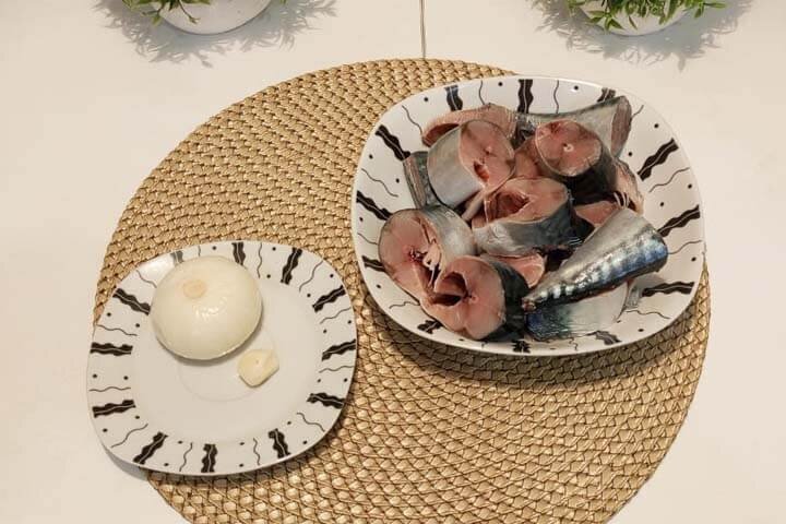 Очень люблю этот рецепт вареной скумбрии. Простой в приготовлении. Такая рыба отлично подойдет для салатов, закусок, также ее можно подавать самостоятельно, с гарниром или без. Продукты Пошаговый рецепт вареной скумбрии Время приготовления: 20 мин Шаг 1: Предварительно приготовьте все продукты, разморозьте рыбу. Голову нужно удалить и рыбу выпотрошите, убрать все внутренности, тщательно помыть, убрать черную поленку. очистите лук, подготовьте перец, соль, лавровый лист. Шаг 2: В кастрюлю налить 1 — 1,5 литра воды, довести до кипения. Шаг 3: Добавляем нарубленный репчатый лук, 1 зубчик чеснока, лавровый лист, перец черный горошком 5 шт., обязательно солим по вкусу. Шаг 4: Варим ориентировочно 20 минут. Пробуем по готовности. Шаг 5: Такая рыба отлично подойдет для пшенной каши с тыквой Сочная и ороматная варенная скумбрия готова!. Приятного аппетита!
