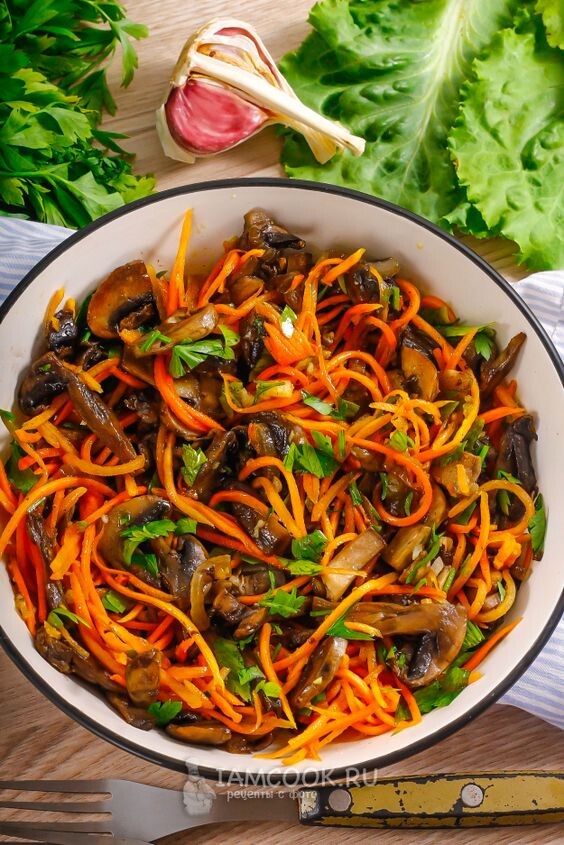 Он безумно вкусный и аппетитный. Обязательно дайте блюду настояться после приготовления примерно 1 час на холоде, чтобы оно все пропиталось чесночным духом, стало более вкусным. Из этого следует то, что салат подается к столу охлажденным! Сорт грибов может быть различным: шампиньоны, вешенки и другие не маслянистые виды. Процесс приготовления вы вольны менять по желанию: сначала поджарить лук и грибы, а затем - морковную нарезку с приправой. Ингредиенты: Шампиньоны - 250 г Морковь - 2 шт. Лук репчатый - 1 шт. Чеснок - 2 зубчика Приправа для моркови по-корейски - 1 ч.л. Соль - 1 щепотка Петрушка - 5-6 г Масло растительное - 40 мл Морковь очистите от кожуры и промойте в воде. Натрите в глубокую емкость на специальной терке для моркови по-корейски. Допустимо приобрести такую закуску в магазине и освободить себе немного времени! Влейте на сковороду 20 мл растительного масла и прогрейте его. В этот момент очистите чесночные зубчики и промойте. Выложите в масло морковную нарезку, спрессуйте