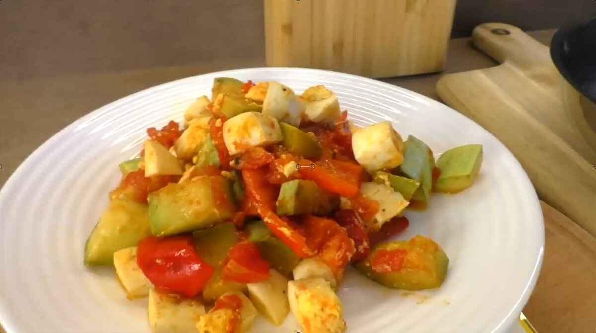 Привет, друзья! Во время похудения сложно выбрать блюдо на ужин. Обязательно нужно что-нибудь сытное и полезное. Как раз такой рецепт у меня есть. Приготовим две порции легкого, быстрого и простого ужина. Одним из ингредиентов будет кабачок. Он является низкокалорийным, так как в 100 гр. такого продукта всего 24 ккал. Один из самых гипоаллергенных продуктов подойдет даже детям. Нам понадобится Способ приготовления Один сладкий перец нарезаем средним кубиком. Предварительно разогреваем сковороду и добавляем растительного масла. Теперь можно отправить наш перец жариться. Ну а пока займемся кабачком. Я взяла молодой кабачок среднего размера. Они гораздо вкуснее, так как у старых плодов не такой насыщенный вкус. Нарезаем его на крупные кубики и отправляем к перцу в сковородку. На огне выше среднего обжариваем овощи 7-10 минут. За это время нарежем один томат. Я разрезаю сначала на кружочки, а потом уже на кубики. Добавляем в сковороду. Убавляем огонь до среднего и хорошо все перемешива