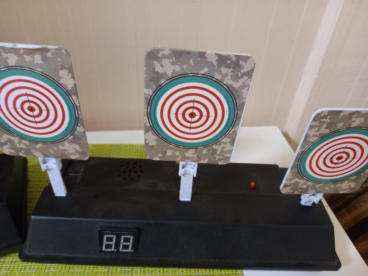 У мальчишек 8-12 лет, наверное самые любимые игрушки - конструкторы и оружие. Оружие любое. Даже палка, найденная на улице становится копьем, стрелой, дубинкой и т.д. Но самое популярное на мой взгляд - Nerf. У нас оно тоже есть, в виде двух небольших пистолетов. Я их сразу брала с условием - не стрелять в людей, друг в друга. Пульки хоть и мягкие, но могут травмировать. Банки, дартс, солдатики и кегли, но не друг в друга. Не всегда это правило точно соблюдалось(. И как- то случайно, увидела в Фикс прайс такую игрушку - Электронная мишень. Стоила она тогда 199р. Сейчас дороже. Взяла сразу, это было то, что надо для игр с Nerf в условиях квартиры. Расскажу подробнее об этой мишени. Электронная мишень из Фикс прайса Игрушка работает от батареек, которые в комплект не входят. Самих мишеней три. Ставим их вертикально. Устанавливаем на ровную поверхность. Желательно, чтобы за мишенями была стена, иначе замучаетесь, искать куда улетели пульки. На основании находится рычажок включения