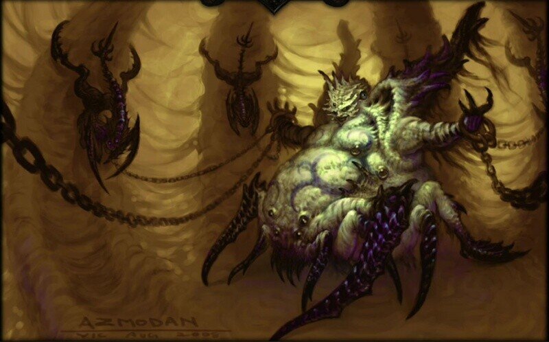 И вот, мало-помалу, сплошной мрак стал рассеиваться, и мы увидели под собой зияющую бездонную пропасть, в недрах коей полыхало багровое пламя и клубились, словно над пылающим городом, густые облака дыма. Где-то внизу, на огромном расстоянии от нас, повисло черное, но ослепительно яркое солнце, окруженное расходившимися от него во все стороны огненными тропами, по которым, вертясь, словно в танце, ползали гигантские пауки, гонявшиеся за добычей, представлявшей собой убегавших, а скорее уплывавших от них в бесконечную глубь существ преотвратительной формы, порожденных пронизывавшим все вокруг разложением. Воздух был буквально запружен ими, и казалось, что он из них состоит. Существа эти были дьяволы, имя коим – Демоны Воздуха. И тогда я спросил у моего спутника, в чем же заключается уготованный мне на веки вечные жребий, и он мне ответил: «Твой вечный удел – быть меж черными и белыми пауками».