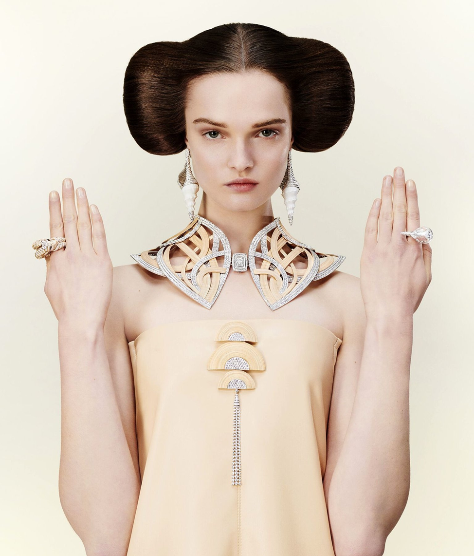 Ювелирный дом Boucheron не перестает удивлять поклонников. В этом году они представили новую коллекцию «5 миров». Не скажу, что мне все понравилось, но зацепила именно идея дизайнеров. Эта коллекция – приглашение в путешествие по мирам, где нет границ, а возможно все. Клер Шуан действующий креативный директор ювелирного дома, объединила в одной коллекции миры и материалы, которые, казалось бы, соединить невозможно – пустыни и океаны, огонь и вода, бриллианты и обычная галька, золото и обожженное дерево. Здесь это не важно. Значение имеет только первозданность природы и ее красота. Femme Sable Песчаная вселенная представлена во всей палитре золотого, коричневого, белого. Центральный объект данной вселенной – колье-воротник из золота и ротанга. В центре всего этого невозможного великолепия – бриллиант. Пески приглашают полюбоваться трехъярусной брошью, украшенной 379 бриллиантами, сверкающими на фоне ротанга и двух видов золота, а также кольцо с птицей. Завершает часть коллекции пара се