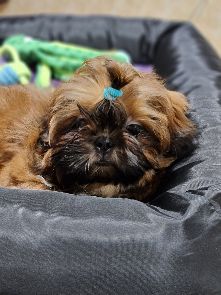 Если честно, то я считала, что чем раньше забираешь щенка домой, тем лучше проходит его адаптация в новом доме. Но из питомника мы забрали Эклера после того, как ему были поставлены все щенячьи прививки, уже в трехмесячном возрасте. И я переживала, что он уже привык к заводчику и будет тяжело привыкать к нам. Но к счастью, мои переживания не оправдались. Эклер оказался полностью социализированным, общительным щенком. Он радостно встретил нас в питомнике, облизал. Прекрасно перенёс дорогу. Конечно же ему не понравилось, что его посадили в переносу и куда-то повезли, и он начал поскуливать. Признаюсь, я не выдержала и взяла его на руки. И Эклер спокойно сидел всю дорогу у меня на руках пока мы ехали в машине. Дома Эклер очень радостно встретился с детьми. Прыгал вокруг них, облизывал. Он совсем не был напуган тем, что оказался в незнакомом для него месте, что вокруг него незнакомые люди. Активно играл заранее приготовленными для него игрушками. Сразу же усвоил, где его место. (Х
