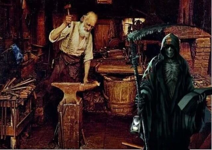 "Вы-кузнец? -голос за спиной раздался так неожиданно, что Василий даже вздрогнул. К тому же он не слышал, чтобы дверь в мастерскую открывалась и кто-то заходил вовнутрь. -А стучаться не пробовали? -грубо ответил он, слегка разозлившись и на себя, и на проворного клиента. -Стучаться? Хм... Не пробовала -ответил голос. Василий схватил со стола ветошь и, вытирая натруженные руки, медленно обернулся, прокручивая в голове отповедь, которую он сейчас собирался выдать в лицо этого незнакомца. Но слова так и остались, где-то в его голове, потому, что перед ним стоял весьма необычный клиент. -Вы не могли бы выправить мне косу? -женским, но слегка хрипловатым голосом спросила гостья. -Всё, да? Конец? -отбросив тряпку куда-то в угол, вздохнул кузнец. -Ещё не всё, но гораздо хуже, чем раньше -ответила смерть. -Логично -согласился Василий. -Не поспоришь. Что мне теперь нужно делать? -Выправить косу -терпеливо повторила Смерть. -А потом? -А потом наточить, если это возможно. Василий бросил взгляд