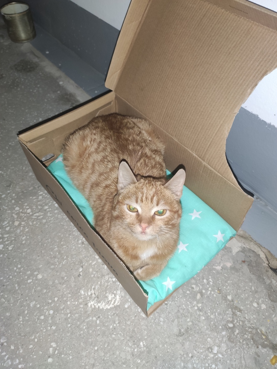 Нашу рыжую девочку мы встретили 28 февраля несколько лет назад в подъезде дома, где тогда жили. Возвращаясь с работы мы как всегда пошли по лестнице на свой второй этаж, а она сидела на площадке между первым и вторым этажами. Она встретила нас приветливым мяу и стала игриво тереться об ноги. На тот момент мы не планировали брать ещё одного хвостика, поэтому я вынесла ей корм с водой, а муж опубликовал пост о поиске хозяев для кошечки. Ночью я долго не могла уснуть, всё думала об этой огненно-рыжей девчонке, но сказать мужу о своей готовности забрать её ещё не решалась. Утром мы обнаружили, что соседи сделали ей домик из обувной коробки и она замечательно там устроилась. Откликов на пост в соц. сетях не было, только репосты(( Весь день она не выходила у меня из головы, после обеда я считала часы и минуты чтобы поскорей вернуться домой, очень надеялась, что она всё ещё будет там и никто не посмел её выкинуть на мороз. Февраль на Урале очень морозный. Мужу тоже "все уши прожужжала", он уж