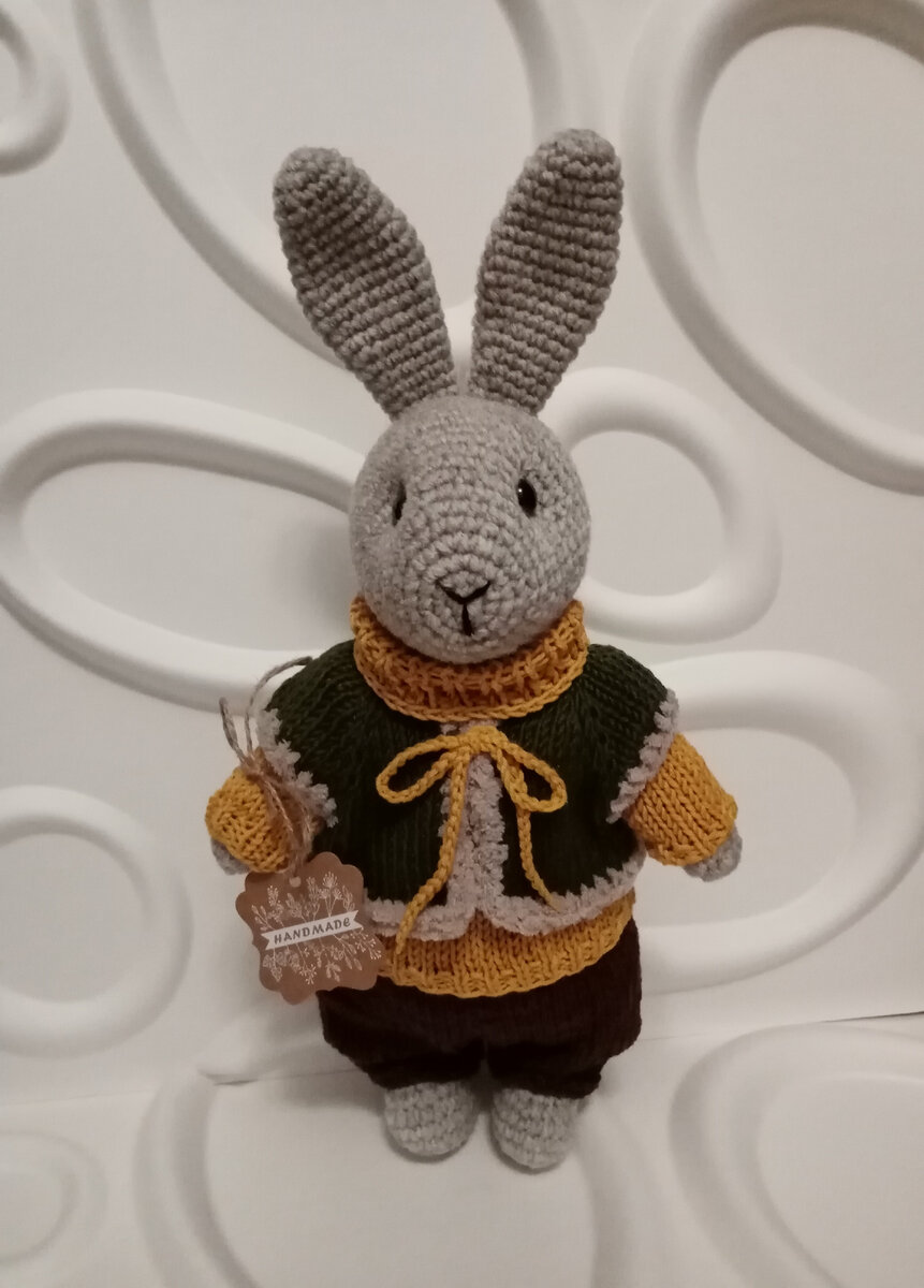 Связан зайка из Ализе лана голд, рост игрушки с учётом ушек - 37 см., наполнитель синтепух, глазки на безопасном креплении, носик вышит. Одежда (штанишки, свитер, жилетка) съёмная. При вязании использовала разные схемы из свободного доступа, зайка получился толстенький, кругленький и хорошенький)) Листайте фото