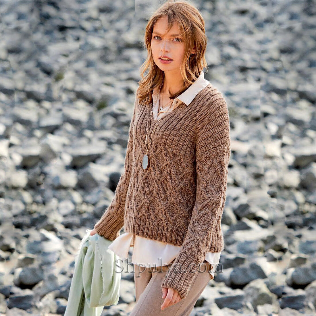 Пуловер с узором из «кос» и V-образной горловиной