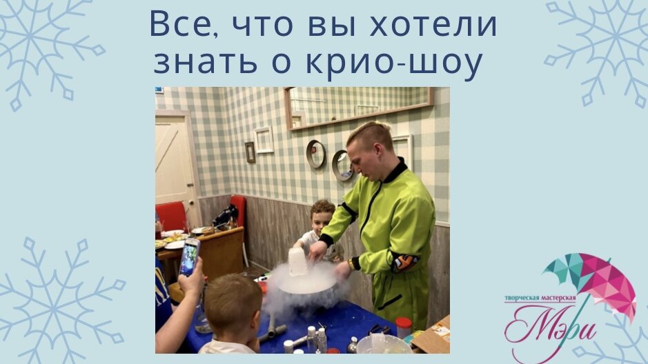 Давно думаете заказать на детский праздник крио шоу, но не знаете, что это такое? Тогда вот подробная информация о том, как проходит этот перфоманс ☺️ Крио шоу может быть с мороженым или без. По сути, это волшебное представление, на котором ваши дети погружаются в эксперименты с разными веществами и реквизитом. Не волнуйтесь, проходит мероприятие под контролем специалиста. Крио-шоу — прекрасный выбор для самых разных детей, даже если они не очень знакомы друг с другом. Зрелищное представление позволит сплотить их между собой. А пока вы думаете, стоит ли его взять для своих деток на праздник, вот ещё несколько секретов: ❄️ В процессе экспериментов дети принимают активное участие ❄️ Ведущий — настоящий безумный ученый 🧑🔬, который объяснит все по-научному 🤓 ❄️ Захватывающие опыты погружают в атмосферу супер-секретной лаборатории 🧪 ❄️ Это безопасно, а главное — необычно! ❄️ В финале все гости попробуют мороженое и наслаждаются результатом! Все наши аниматоры получают т
