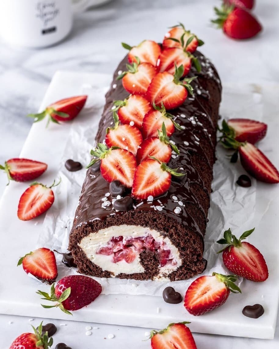 Ингредиенты: 🔻Для бисквита:🔻 🍓4 яйца 🍓1 щепотка соли 🍓120 г сахара 🍓100 г муки 🍓30 г какао 🍓1 ч.л. разрыхлителя 🔻Для начинки:🔻 🍓500 г клубники 🍓300 г жирного творога 🍓100 г маскарпоне 🍓100 г сливок 🍓1 чайная ложка ванильной пасты или ванильный сахар 🍓50 г сахара 🍓2 чайных ложки лимонного сока 🍓2 пакетика загустителя для сметаны 🔻Для украшения:🔻 🍓40 г темного шоколада 🍓20 г мягкого масла 🍓Клубника Приготовление: 🔴 Бисквит: Разогрейте духовку до 180 градусов. Выровняйте противень (30x40 см) бумагой для выпечки. Взбить яйца с сахаром, добавьте соль. Смешайте муку, какао и разрыхлитель и тремя порциями добавьте в яичную смесь, аккуратно перемешайте. 🔴 Выложить тесто на противень и разровнять. Выпекать в предварительно разогретой духовке около 12 минут. Вынуть из духовки, прикрыть полотенцем, посыпанное сахаром, аккуратно снять бумагу для выпечки. Сверните рулет вместе с полотенцем и дайте остыть. 🔴Для начинки: Промыть и очистить клубнику, нарезать мелкими куби