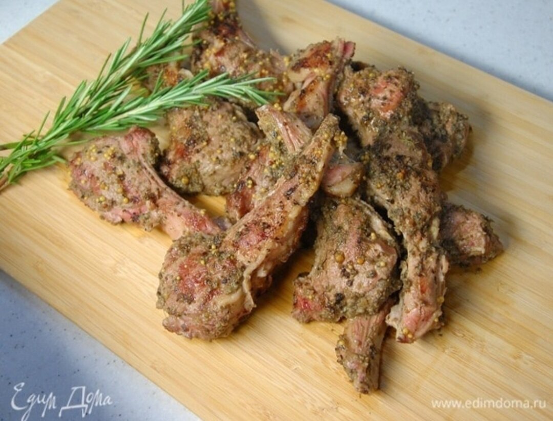 ИНГРЕДИЕНТЫ ребрышки ягненка - 700 г розмарин - 4 веточки вино белое - 50 мл оливковое масло Extra Virgin - 1 ст. л. горчица с зернами - 1 ч. л. лавровый лист - 1 шт. Для маринада маслины без косточек - 2 горсти анчоусы - 3 шт. каперсы - 1 ст. л. лимоны - ½ шт. чеснок - 2 зубчика тимьян - 3 веточки оливковое масло Extra Virgin - 2 ст. л. ПРИГОТОВЛЕНИЕ 2. Приготовить маринад: в чаше блендера соединить маслины, чеснок, оливковое масло Extra Virgin, выжатый из половинки лимона сок, каперсы, анчоусы, листья тимьяна и все взбить. 3. Ребра смазать маринадом и дать постоять 15 минут при комнатной температуре или отправить на пару часов в холодильник. 4. На разогретой сковороде-гриль пожарить замаринованное мясо с одной стороны. 5. К белому вину влить оливковое масло, добавить горчицу, лавровый лист и перемешать. 6. Перевернуть ребрышки, полить вином с горчицей и жарить до готовности. 7. Готовое мясо выложить на деревянную или прогретую в духовке керамическую доску, украсить веточками розм