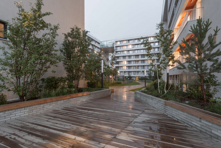Центральная часть двора – место отдыха, детских игр и сбора жителей. Небольшие палисадники, расположенные по периметру, создают буферную зону для квартир нижнего уровня, а установленные на каждом балконе потолочные кессоны поглощают и рассеивают звуки. Благодаря большим проемам арок и стеклянным мостам со светоотражающими шторами, пространство наполнено светом и воздухом и предлагает убедительную альтернативу как дворам-колодцам, так и слабо артикулированным дворам современных микрорайонов.