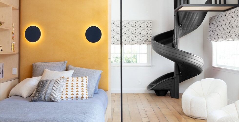 Эта спальня от дизайнерской студии из Калифорнии представляет собой идеальную игровую зону для подросшего мальчика, секретный уголок в доме, в который не так-то просто попасть. Лестница в комнату превращается в горку, над полноразмерной кроватью натянут гамак, в котором можно весело проводить время с друзьями. Такая надстройка позволяет освободить место на полу.