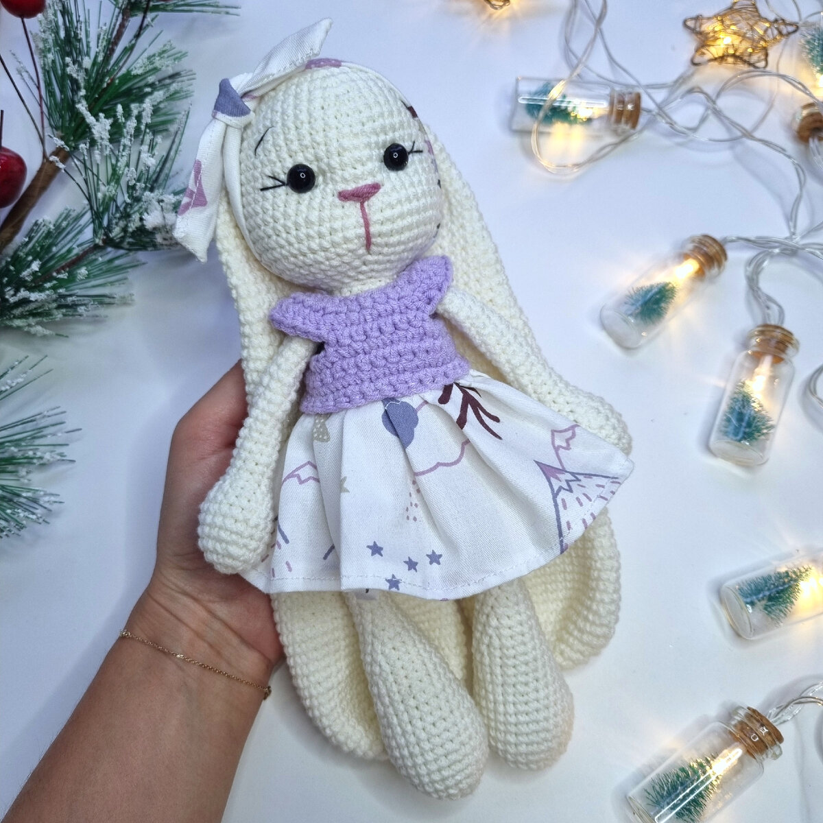 Много вопросов поступает как вяжу этих заюшек. Надеюсь небольшой экспресс мастер-класс сможет вам помочь связать эту малышку😊. Расход на зайку с длинными ушами - 60 гр Ализе коттон голд. За основу взят МК с Ютуб Маруси Прокопенко, по нему я вязала тело, решила ни чего не изменять и оставить как есть. Тело и голову я вяжу полукрестиками. Уши галочками, чтоб были пластичными. Голова 1. 6 п в ка 2. 6 пр (12) 3. (1 сбн, 1 пр)*6 (18) 4. (2 сбн, 1 пр)*6 (24) 5. (3 сбн, 1 пр)*6 (30) 6. (4 сбн, 1 пр)*6 (36) 7. 36 сбн (36) 8. (5 сбн, 1 пр)*6 (42) 9-10. 42 сбн (42) 11. (6 сбн, 1 пр)*6 (48) 12-19. 48 сбн (8 рядов) 20. (6 сбн, 1 уб)*6 (42) 21. (5 сбн, 1 уб)*6 (36) 22. (4 сбн, 1 уб)*6 (30) 23. (3 сбн, 1 уб)*6 (24) 24. (2 сбн, 1 уб)*6 (18) Глазки 8 мм между 13 и 14 рядами Между глазками 8 п Уши (галочками) 1. 6 п в ка 2. 6 пр (12) 3. (1 сбн, 1 пр)*6 (18) 4. (2 сбн, 1 пр)*6 (24) 5. (3 сбн, 1 пр)*6 (30) 6. (4 сбн, 1 пр)*6 (36) 7-13. 36 сбн (36) (7 рядов) 14. (10 сбн, 1 уб)*3 (33) 15-19. 33 сбн (3