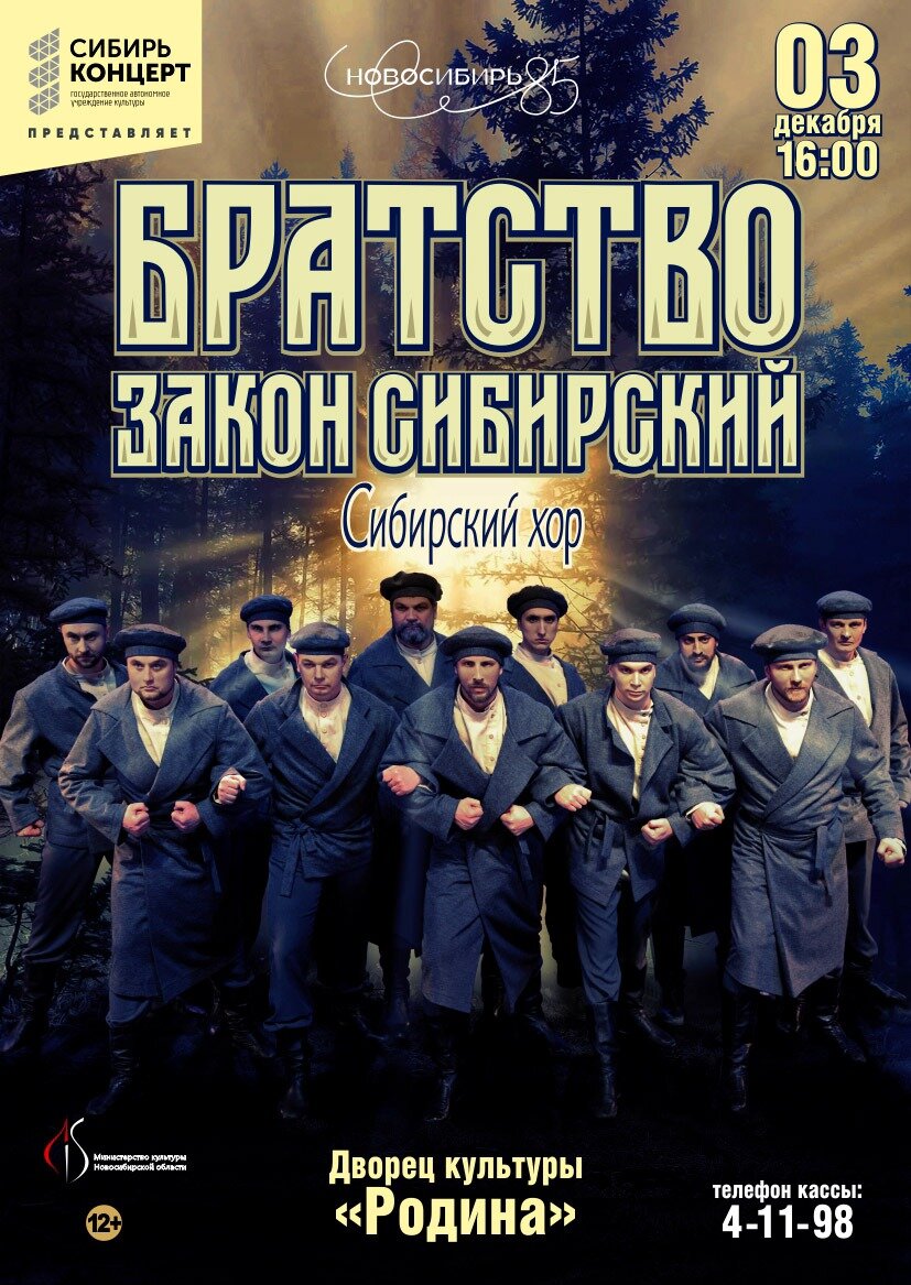 «Братство-закон Сибирский». Концертная программа Государственного академического русского народного Сибирского хора. 12+ 3 декабря 16:00 Дворец культуры «Родина», большой зал В основу программы легла историческая составляющая, связанная с освоением бескрайней, суровой, прекрасной, проверяющей человека на прочность Сибири. Концертная программа «Братство – закон сибирский» - это сказ о великом пространстве края, через трагичные судьбы людей, проживающих назначенное судьбой, через конфликт, через единение песней, танцем, музыкой, невольно сплачиваемых одним путем в невыносимых условиях. Наши герои идут в Сибирь по этапу, путь их полон препятствий и долог нестерпимо. Всё есть на этом пути: и испытания, и состязания, и мечты. Нет на свете такой другой Сибири, где был бы мир и дом каждому, не смотря на разные чины. Лишь бы был душою Человеком. «Братство-закон сибирский» - это признание в любви к родной земле, восхищение ею, той, которая приняла, сохранила и вырастила людей из разных сторон и