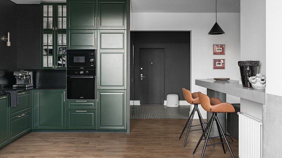 Угловой кухонный гарнитур заказали в ИКЕА — это было пожелание хозяина. Эффектный зеленый цвет фасадов «Будбин» идеально подошел задумке. Верхние модули разместили только по одной стене, вторую оставили пустой, сделав акцент на большой вытяжке и бра.