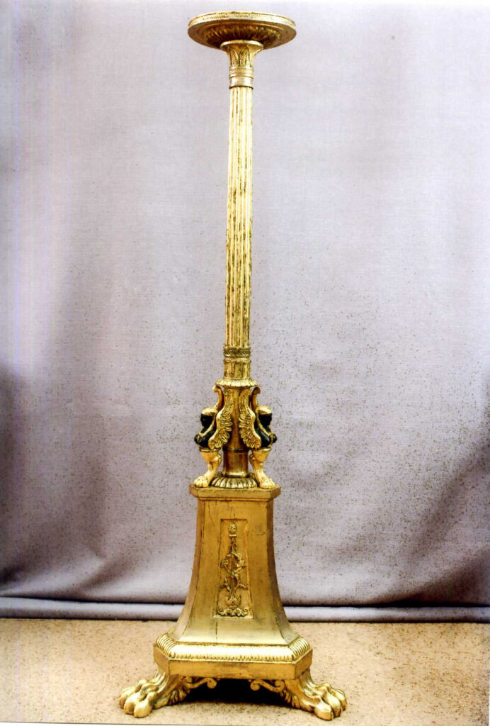 Напольный торшер - декоративный обстановочный предмет, тип античного треножника в виде узкой колонны с канелюрами на высоком, расширяющемся книзу пьедестале, опирающемся на резные львиные лапы. В декоре применены ампирные мотивы - в основании колонны на пьедестале установлены фигурки сфинксов, выполненные из мастики. Венчает предмет круглая площадка. Основой для изготовления таких предметов, как правило, служила сосна, а резной декор выполняли из липы, древесина которой мягкая, пластичная и ее легко резать. Резные детали наклеивали. Затем предмет покрывали левкасом. Левкас - это грунт, изготовленный, в основном, из смеси мела и клея, на который наносили позолоту. Мастика, из которой выполнены фигурки сфинксов изготовлена также из густой смеси мела и клея, в горячем виде ей придавали форму, когда же материал остывал, он становился достаточно прочным.