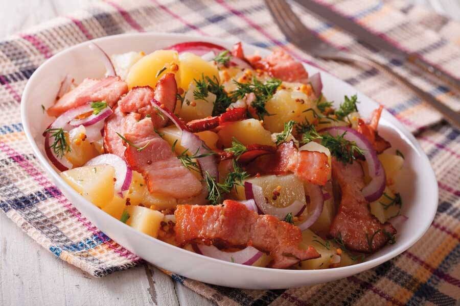 Немецкий картофельный салат с луком и беконом 📖 Ингредиенты: - Картофель - 2 шт. - Маринованный огурец - 3-4 шт. - Лук - 1 шт. - Бекон - 6 ломтиков - Чеснок - 1 зубчик - Горчица зернистая - 1 ст. л. - Укроп, петрушка - по вкусу - Нерафинированное растительное масло - 20 мл. - Соль, перец - по вкусу 🧑🏻🍳 Приготовление: 1. Картофель отварить в мундире, остудить и нарезать кубиками. 2. Бекон обжарить, крупно порезать. 3. Огурцы порезать колёсиками. 4. Лук порезать полукольцами и ошпарить кипятком (чтобы ушла горечь) 5. Колбасу порезать соломкой. 6. Всё смешать, выдавить чеснок, добавить горчицу, зелень. Посолить, поперчить и в конце заправить ароматным маслом. Салат с курицей и черносливом. 📖 Ингредиенты: - Куриное филе - 200 г. - Яйцо - 3 шт. - Чернослив - 120 г. - Грeцкие орехи - 40 г. - Твeрдый сыр - 100 г. - Майонез - для заправки 🧑🏻🍳 Приготовление: ⠀ 1. Куриное филе отварить и разобрать на волокна. 2. Яйца отварить и мелко порезать. Чeрнослив на пару