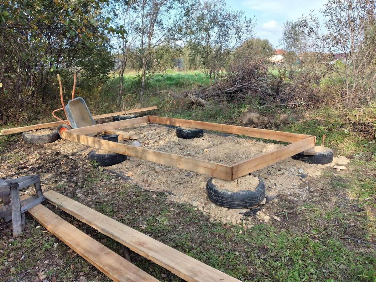 Давно планировал строить баню. Выбрал каркасную технологию из-за скорости строительства и хорошего теплосбережения. Нашел пиломатериал по объявлению на авито, выбрал самые приемлемые по цене, приехал оплатил, через пару дней доставили. Сложил их штабелями через прокладки, накрыл тентом и так оставил. Доски пролежали около 1,5-2 месяцев. Когда просохли, купил расходники, нужные на первом этапе, а именно крепежи (гвозди, саморезы). Антисептик для досок получил в подарок по программе "Семьи Леруа Мерлен". И начал строительство бани. В качестве фундамента сделал просто покрышки наполненные скальником, т.к. этот вариант был самый простой и быстрый, аналог блочному, только проще и быстрее, хорошо пропускает через себя воду. Для каркаса доски из лиственницы 40х150 и 40х100, т.к. лиственница слабо подвержена гниению, а баня довольно влажное помещение. Постелил геотекстиль Изобонд Hard 80г/м2 (купил первое попавшееся из недорогих) под пятном застройки, засыпал небольшим слоем скальник (что б де