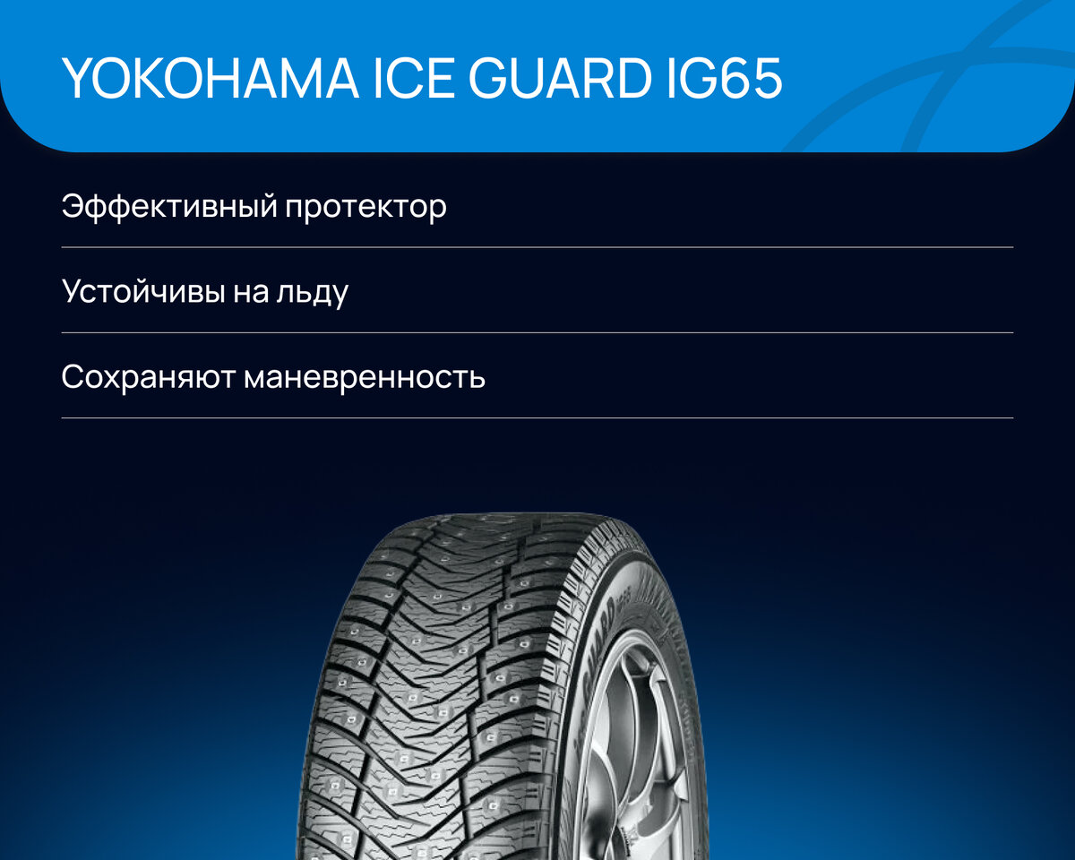 Зимняя шина Yokohama Guard iG65 сменила на заводских конвейерах по всему миру модель с индексом iG55, высоко оцененную автомобилистами стран Северной Европы и России. Новинка превзошла ее по большинству эксплуатационных свойств, благодаря большому количеству нововведений. Вся центральная часть протектора представляет собой очень широкое сплошное продольное ребро. Этот элемент имеет составную конструкцию, содержащую большое количество блоков, соединенных между собой жесткими перемычками. Их сложная многоугольная форма и массивные размеры обеспечивает пятну контакта многочисленными и протяженными гранями, которые препятствуют продольным скольжениям при разгоне и торможении. Блоки, расположенные в плечевых зонах, имеют ряд оригинальных особенностей. Одна из них – это острые боковые грани. Они препятствуют скольжениям на снегу и льду, буквально врезаясь в их скользкую поверхность, чем обеспечивается дополнительная устойчивость при маневрировании. Этот эффект дополнительно усиливается многочисленными кромками, образуемыми вертикальными и горизонтальными канавками.
