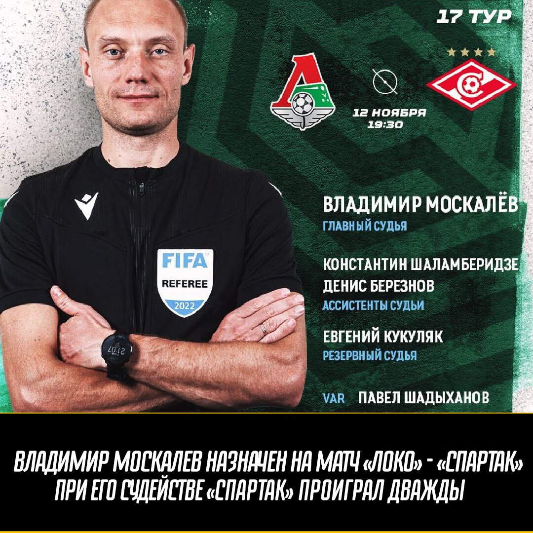 👉 36-летний арбитр из Воронежа Владимир Москалев назначен на центральный матч 17 тура РПЛ между «Локомотивом» и «Спартаком», который состоится 12 ноября, в 19:30.