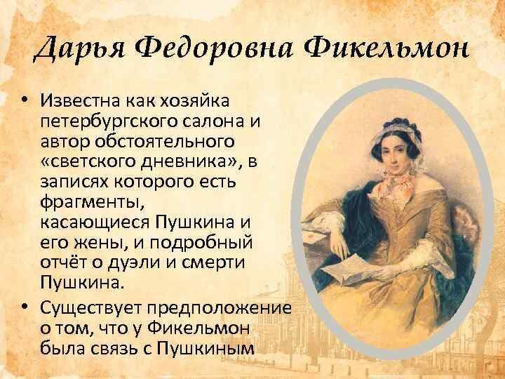 Дарья Фёдоровна живо интересовалась литературой и музыкой, религиозно-философскими вопросами и политикой. Её близкими друзьями были П. Вяземский, А. Тургенев, И. Козлов. Салон графини Фикельмон часто посещал Пушкин. По словам П.А. Вяземского: «Вся животрепещущая жизнь европейская и русская, политическая, литературная и общественная, имела верные отголоски в этих двух родственных (Хитрово-Фикельмон) салонов.