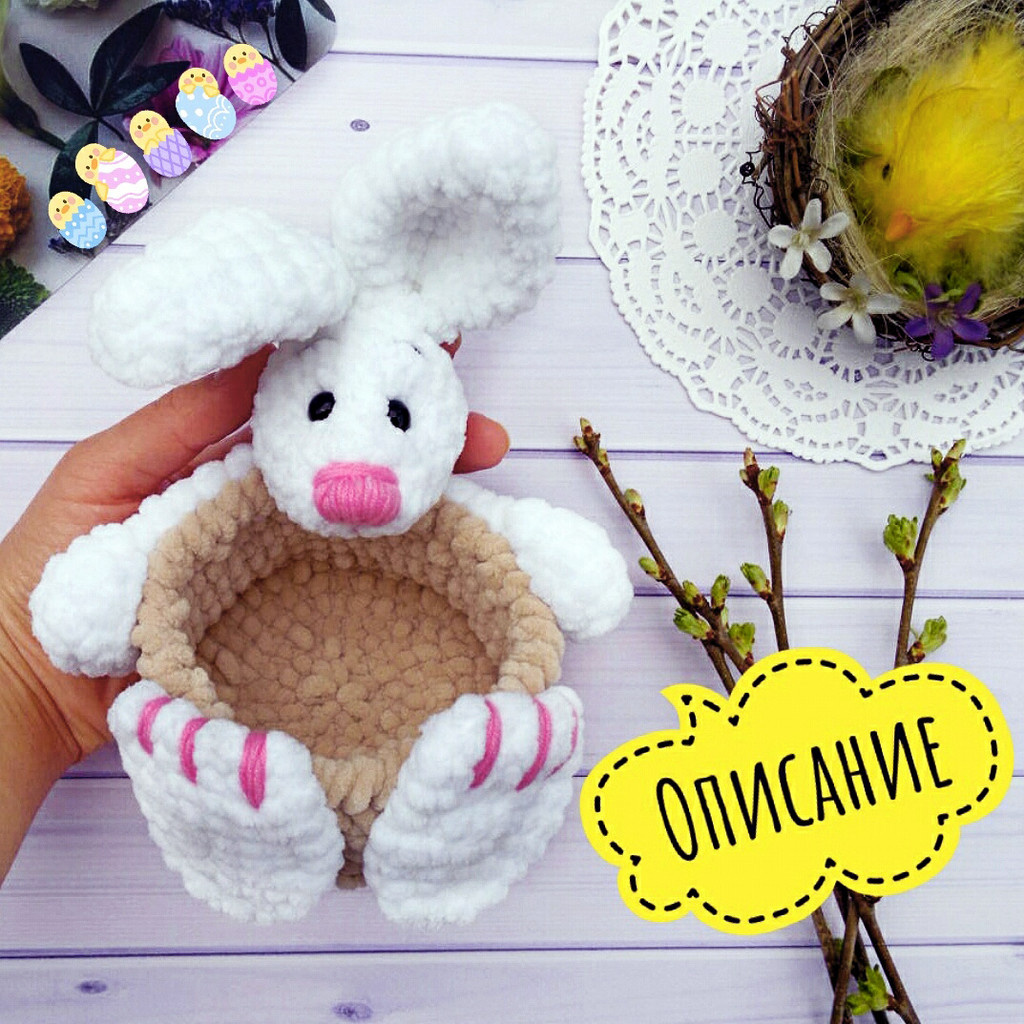 Материалы: Диаметр корзинки 10-12 см, будет зависеть от плотности Вашего вязания. Высота от дна корзинки до ушек зайца примерно 19 см. Условный обозначения: